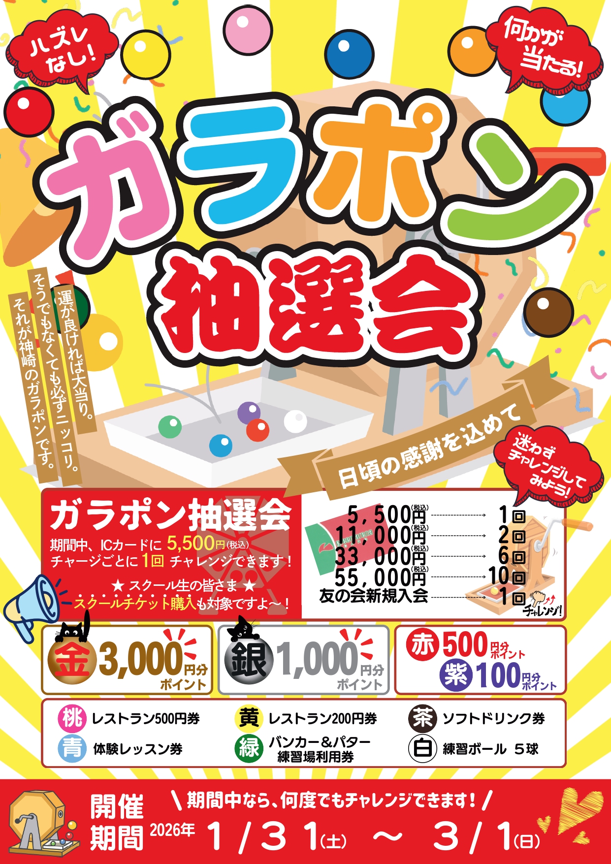 1/31(土)~3/1(日)の期間、【ハズレなし!】 ワクワクドキドキ「ガラポン抽選会」を開催します