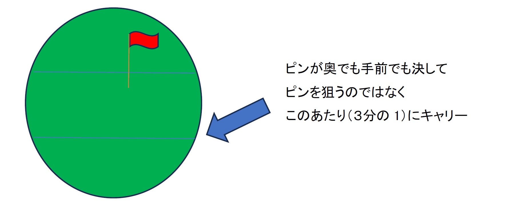 砲台グリーンはピン位置に関わらず、ボール落としどころのイメージは「手前から3 分の1」のところに設定しましょう。
