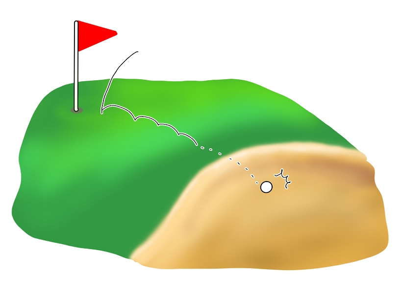 雨上がりのバンカーで誰も打った痕跡がない場合があります。この時は水分で砂が締まったような状況になっています。いわゆる「硬いバンカー」と同じような状況です。こんな時はあまりクラブフェースを開かずボールの手前の砂を取るという感じになります。